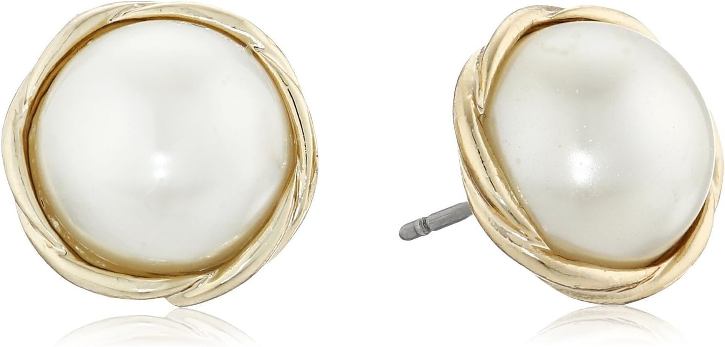 • GOLD TONE & FAUX PEARL STUDS: Your eye for style shines bright with these stud earrings featuring faux-pearl rounds in twisted gold-tone frames. They feature bullet-clutch with disc backings.
