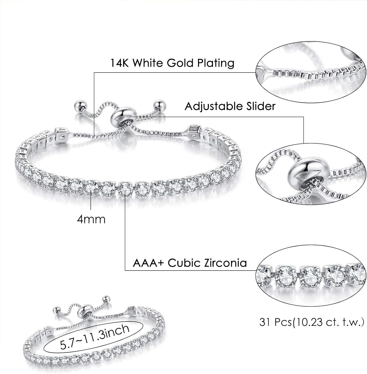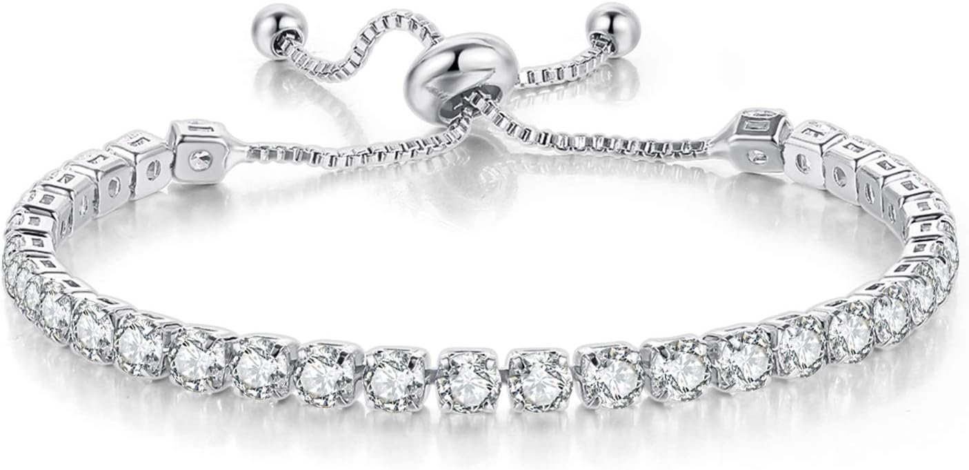 - 【PREMIUM QUALITY】Classic tennis bracelet features round 4mm AAA+ cubic zirconia.Under the Heart & Arrow cutting effect,every simulated diamond restores item natural beauty and extremely brilliance.We use four-claw inlay technology which can make the zircon stay more stable on the bracelet.The shiny zircon is firmly embedded in the bracelet,reducing the risk of zircon falling and increasing the life of the bracelet.This stunning bracelet ensures a long-lasting and brilliant finish.