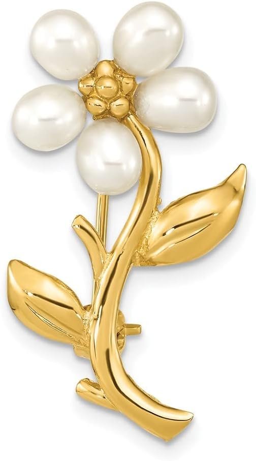 Yellow Gold 4-5mm White & Rice Freshwater Cultured Pearl 29x17mm Flower Brooch